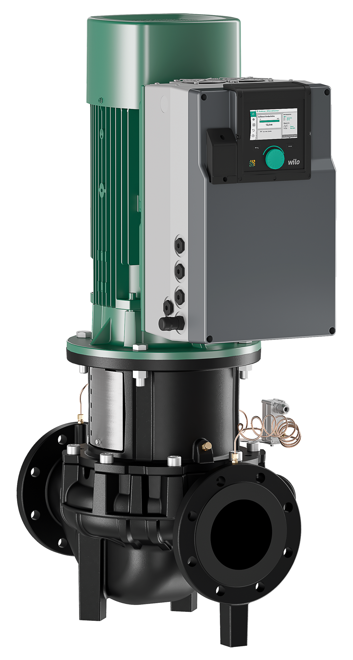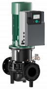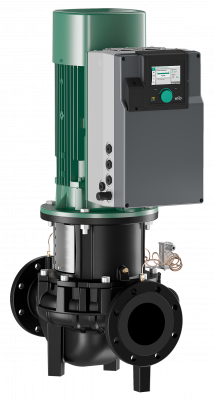 High-efficiency in-line twin-head pump with EC motor and electronic power adjustment in glanded pump construction. Version as single-stage low-pressure centrifugal pump with flange connection and mechanical seal.
