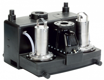 Compact, ready for connection and fully submersible double pump lifting unit for pumping sewage containing faeces.